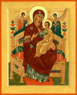 Суть любой иконы очень точно передается ее изображением, главное уметь его "прочитать". Композиция, позы Богородицы и Спасителя, выбранные художником цвета - все здесь неслучайно, все подчинено тому, чтобы создать нужный настрой у молящегося. В иконе "Всецарица" главный мотив - мотив царственной власти Богородицы над всем живым. Поэтому понятно, почему Божья Матерь изображена восседающей на троне - символе высшей власти. Но обратите внимание, как царственная торжественность позы Богородицы смягчается жестом любви и моления: голова Богородицы склоняется к Спасителю, Ее правая рука просительно воздета к Нему. Этот жест молитвенного обращения образует плавный полукруг, который продолжается строгими, но тоже плавными линиями позы сидящего Богомладенца. В левой руке Христа свиток, в котором записан Закон, а вот правой рукой Он благословляет, и этот жест благословения - ответ на молитвенное прошение Богородицы. Плавные линии фигур Богородицы и Христа усиливаются полукругом спинки трона, и если присмотреться повнимательнее, то здесь можно раскрыть главную загадку иконы. Композиция ее такова, что человек, стоящий перед ней, оказывается включенным в этот полукруг, он его замыкает, закольцовывает, именно нас, стоящих перед "Всецарицей", не хватает для законченности. Более того, если мы обратим внимание на то, куда направлены взгляды Богородицы и Христа, то мы поймем, что куда бы при этом не смотрел человек, стоящий перед иконой, взгляд его также окажется вовлеченным в единое пространство с Ними. Так, благодаря искусству иконописца, именно стоящий перед иконой, становится центром, сосредоточием всего. И это касается не только пространства, нет. Главное, молящийся становится вовлеченным в духовное действие - в молитвенное обращение Богородицы к Христу и в Его милующее благословение. Человек и его молитва оказываются необходимым звеном в этом акте божественной любви.