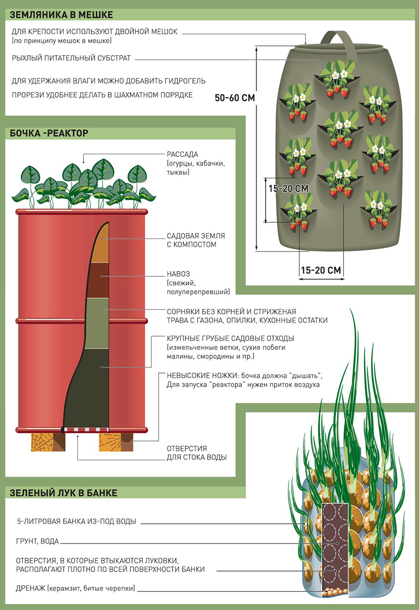 Главное - правильно "набить" бочку. Можно использовать старую дырявую - почва должна "дышать". В новой придется пробить отверстия в дне для стока воды и притока воздуха и поставить ее на невысокие ножки, например, кирпичи или доски. Теперь - о содержимом. Нижняя часть (примерно четверть высоты) - крупные садовые отходы - измельченные ветки, прошлогодние стебли малины, грубые сорняки (без корней). Туда же хорошо идут и отходы со стола. Затем можно использовать зеленую массу после стрижки газона и все, что получается в результате прополки, а также опилки и любые органические отходы. Эту массу хорошо пересыпать свежим навозом - перепревая, вся эта смесь будет выделять тепло. Выше "реактора" - снова слой сорняков. Все это плотно утрамбовывается, а потом добавляется самый верхний слой - не менее 30-40 см - питательная и рыхлая почва с добавлением компоста. Утрамбовывать нужно на совесть - иначе почва быстро осядет и ее придется подсыпать.