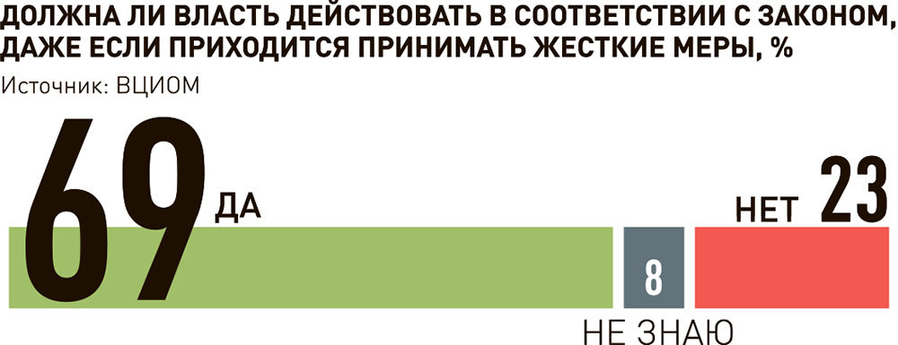 К такому выводу пришел ВЦИОМ в ходе опроса россиян, обнародовав цифру - 69 процентов согласных с жесткими действиями властей в ситуации несанкционированного митинга.