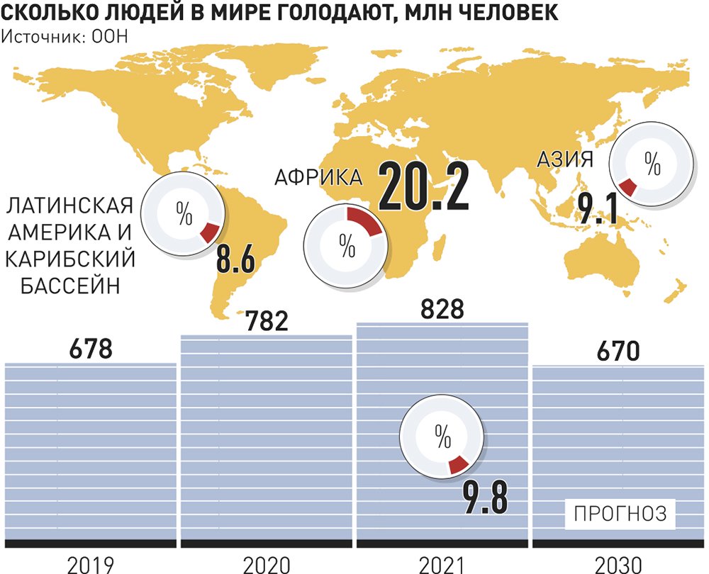 Почти 924 млн человек (11,7% мирового населения) столкнулись с отсутствием продовольственной безопасности в тяжелых формах - это на 207 млн больше, чем двумя годами ранее. Позволить себе здоровое питание смогли еще меньше: в 2020 году отказались от здорового рациона почти 3,1 млрд человек - на 112 млн больше, чем в 2019 году. В основном это жители Азии - там от здорового питания в 2021 году вынуждены были отказаться еще 78 млн человек. На следующем месте по росту этого показателя оказалась Африка (25 млн человек).
