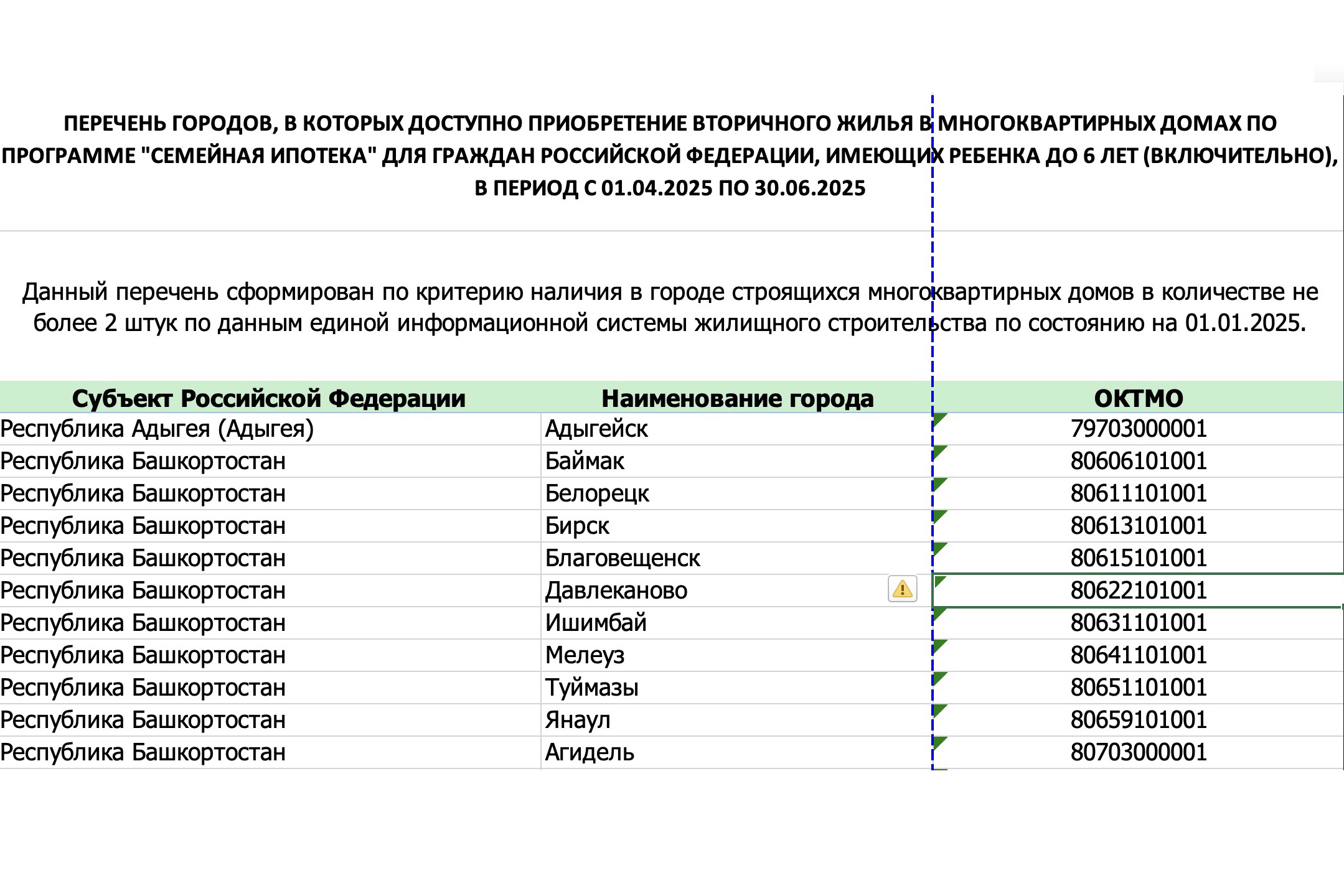 Предлагаем ознакомиться с полным списком городов, где можно взять семейную ипотеку на вторичное жилье (всего в перечне 901 населенный пункт). Для этого скачайте таблицу, размещенную ниже.