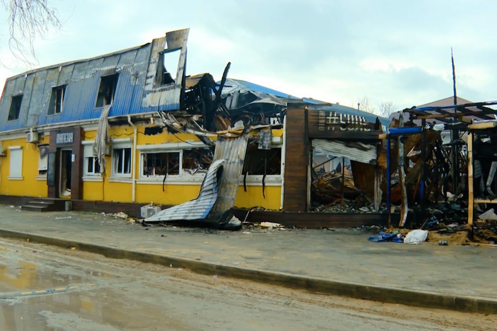 А чуть позже огонь распространился также на штаб волонтеров "Шлагбаум", который располагался в строении на углу между корпусами ресторана и пансионата, и он полностью сгорел.