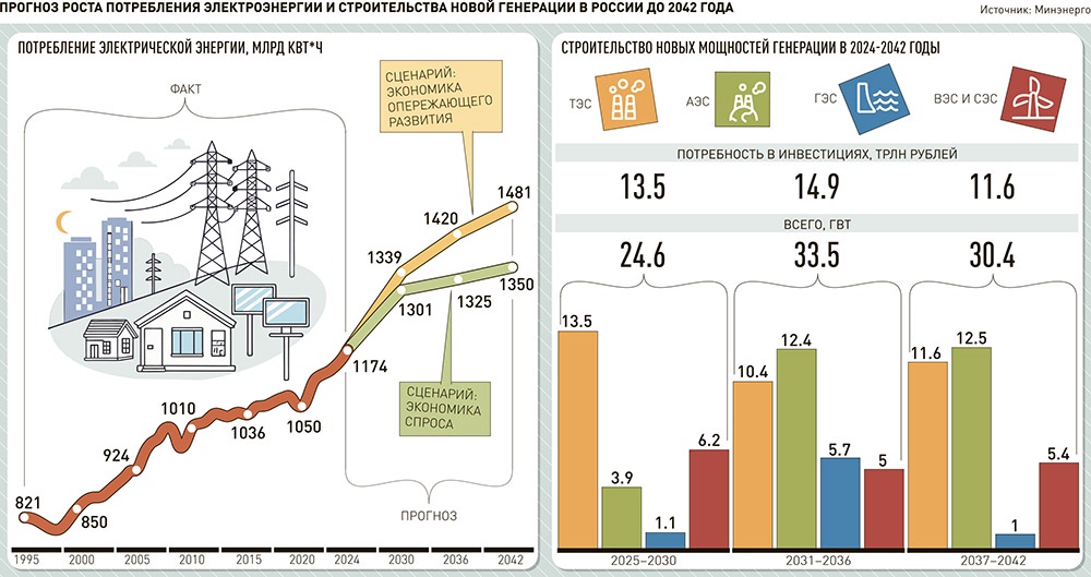 По предварительным расчетам до 2042 года суммарно на это потребуется астрономическая сумма 56,6 трлн рублей (только на новую генерацию и в целом на электросетевой комплекс), не считая создания, модернизации технологий и прочих расходов. Для сравнения, ожидаемые годовые доходы бюджета России в 2025 году составят 40,3 трлн рублей.
