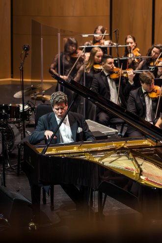 А теперь - впервые - решил выступить с оркестром. Как рассказал мне организатор гастролей Евгений Морозов, "в преддверии 50-летия Дениса Мацуева (11 июня 2025 - прим. ред.) хотелось сделать "не простой, а настоящий юбилейный гранд-концерт с оркестром". Выбор был за пианистом, и он пригласил молодой челябинский коллектив, созданный при его же активном участии в 2019-м. "Для меня приоритетом всегда была помощь нашим региональным коллективам, а это мой любимый, родной оркестр, - говорит Денис Мацуев. - Мы только что провели в Челябинской области наш фестиваль ("Денис Мацуев представляет…" - прим. ред.), до этого сыграли вместе в зале "Зарядье". Оркестр живет, расцветает, его возглавляет талантливый молодой дирижер Алексей Рубин, так что приглашение именно этого коллектива я считаю абсолютно логичным".