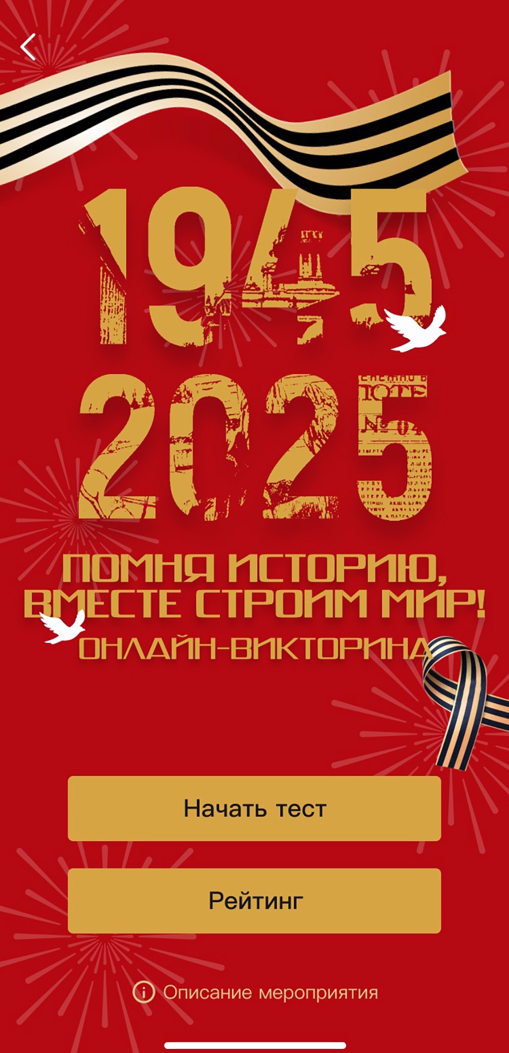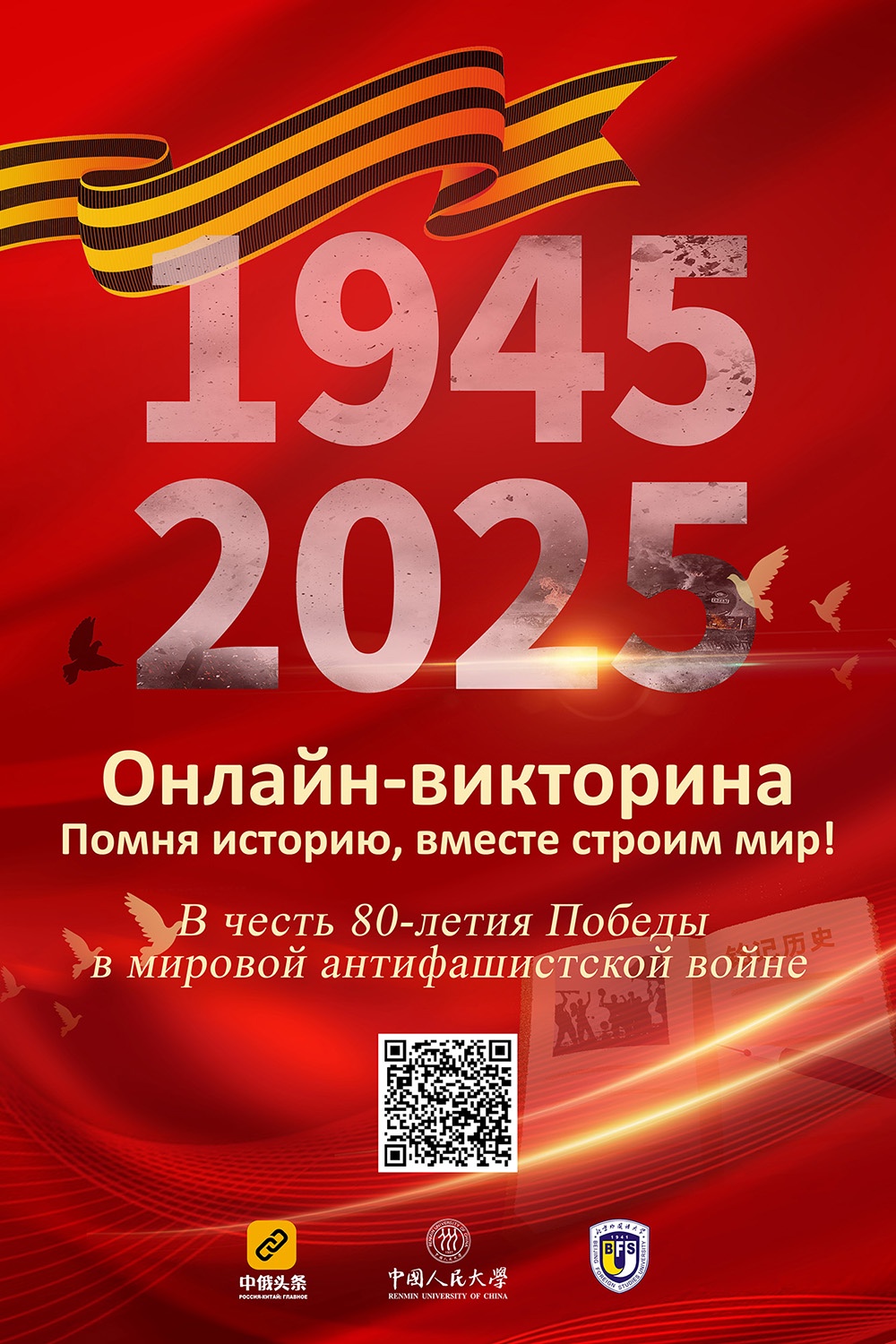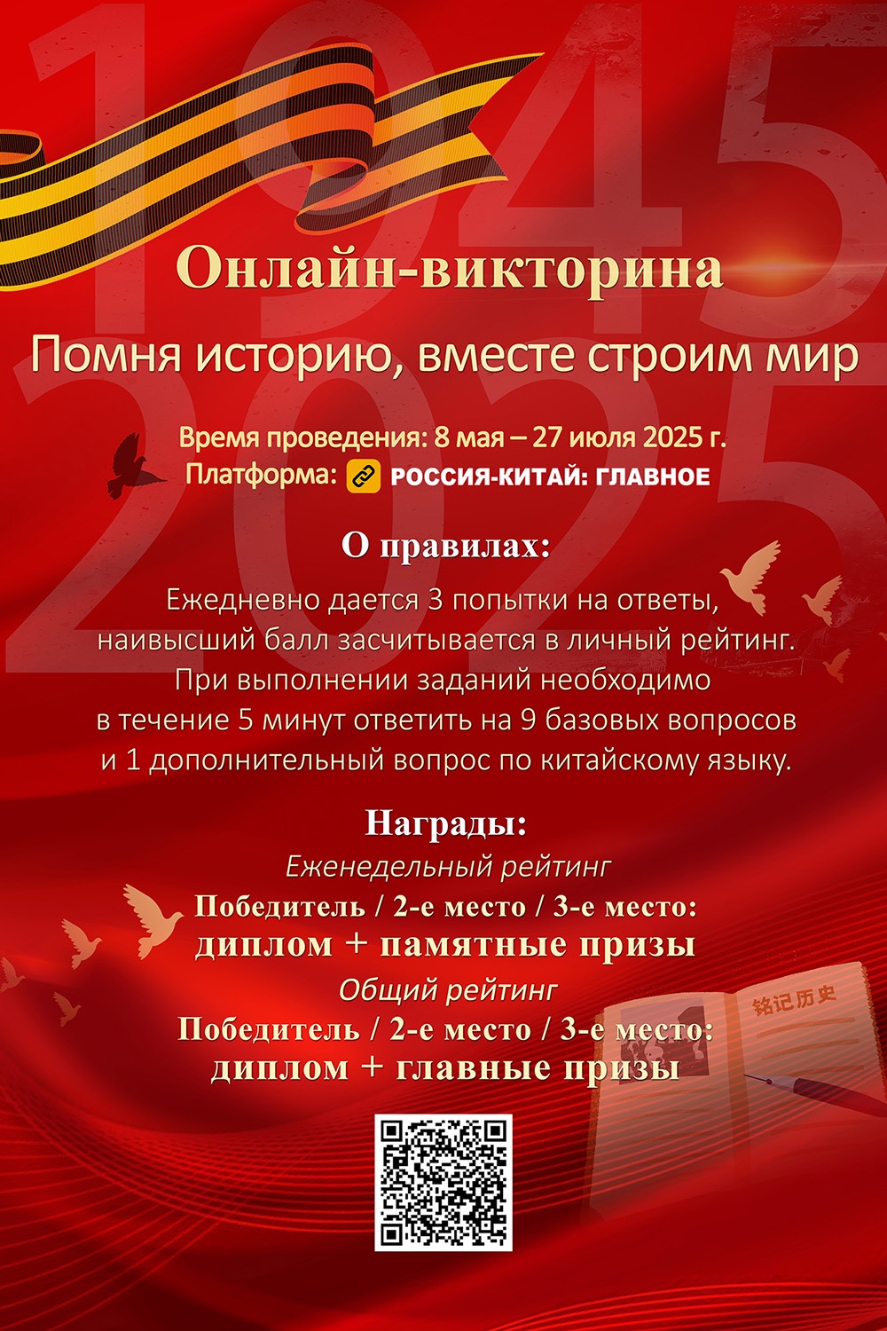 В рамках онлайн-формата викторины, объединенной с серией образовательных видеороликов о Второй мировой войне, участники получают уникальный опыт, сочетающий в себе познавательную, обучающую и развлекательную составляющие. База вопросов для викторины была составлена авторитетными китайскими и российскими историками и экспертами по международным отношениям. Тысячи тщательно отобранных вопросов освещают вклад СССР и Китая в победу над фашизмом, охватывая политические, военные и экономические аспекты Второй мировой войны.
