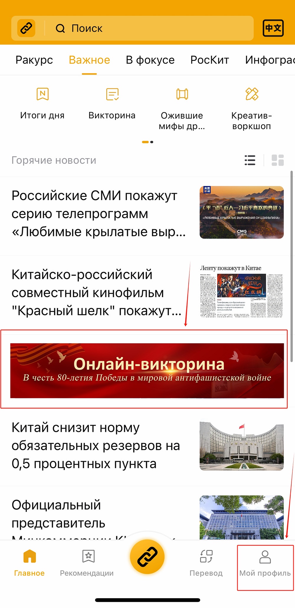 2. Если приложение "Россия-Китай: главное" уже установлено, запустите его, авторизуйтесь, найдите раздел викторины и начните отвечать на вопросы.