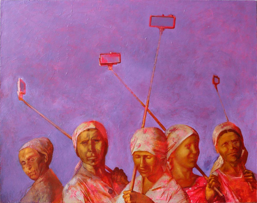 Связь современного искусства с фольклором и игровой народной стихией лишь один из лейтмотивов выставки. Проект "Открытый мир", приуроченный к 80-летию победы в Великой Отечественной войне, подчеркивает и другую линию - трагическую. Она явлена и в плакатах военных лет, и в монументальном, как фриз, полотне Широкова "Хлеб - фронту!" 1967 года, и почти житийных клеймах "Вдовьего натюрморта" Татьяны Нечеухиной, где бабы танцуют одинокий танец друг с другом.