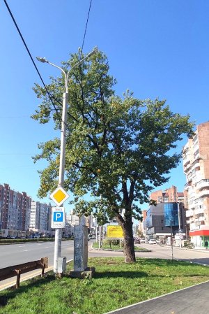 Дерево стоит у трассы, и его постоянно хотели вырубить. Общественники воевали за него десять лет. Сейчас дерево под охраной закона.