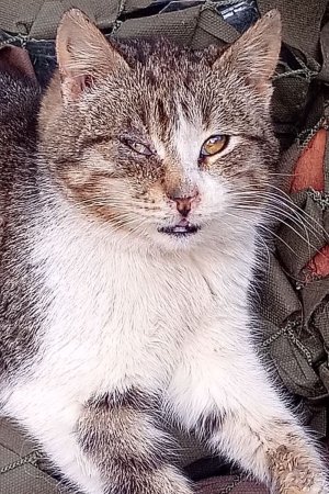 - Здравствуйте, уважаемая Евгения! У нас есть вот такая боевая кошка. Ее мои товарищи принесли с позиции. Она контуженная, на один глаз не видит, и мы ее как можем выхаживаем. Но так как мы очень часто выезжаем на боевые задания, то не можем постоянно за ней присматривать. Мы находимся в селе Петровское в ДНР. По возможности отзовитесь, помогите. Очень жалко кошку.