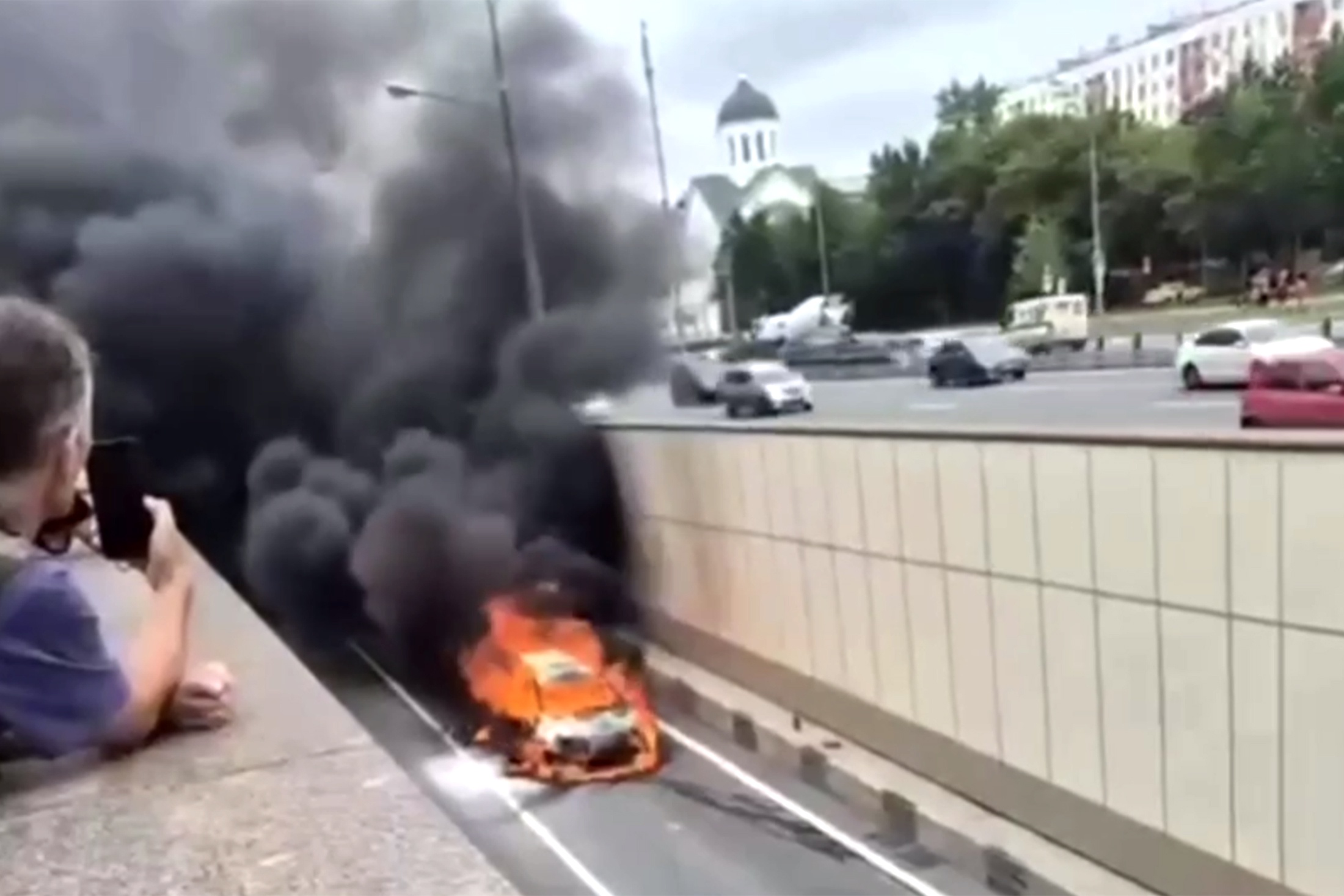 Инцидент произошел на проспекте Маршала Жукова. Огонь быстро охватил иномарку, она выгорела полностью. Водитель остановил машину на въезде в Северо-Западный тоннель и вышел на проезжую часть.