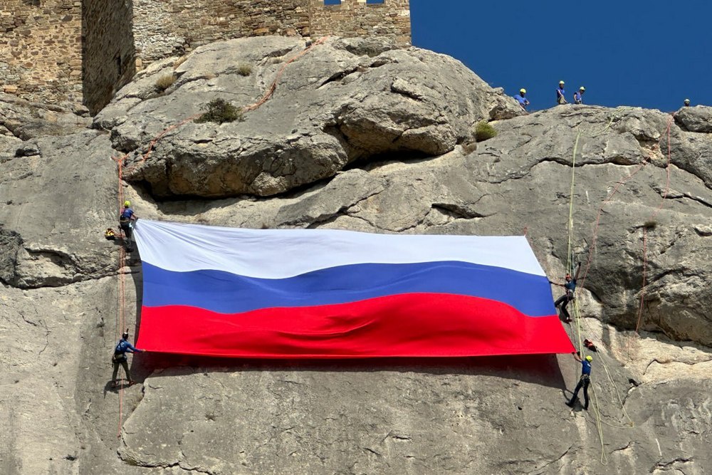 Флаг развернули на почти отвесной скале, закрепившись с помощью альпинистского снаряжения. За необычным зрелищем наблюдали сотни гостей курорта.