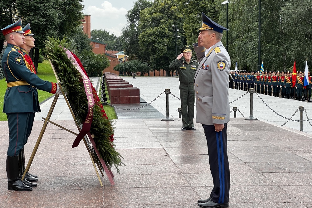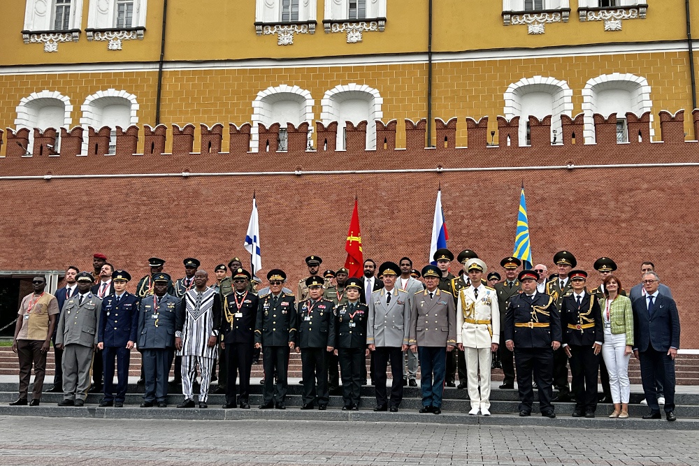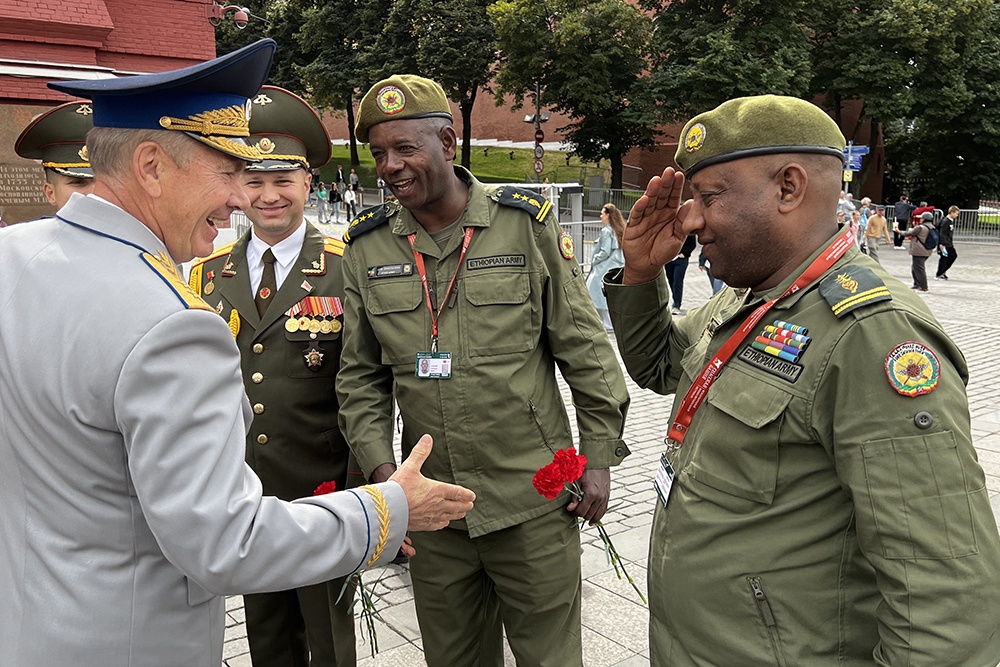 В церемонии возложения венков участвовали представители Буркина-Фасо, Зимбабве, Беларуси, Италии, Казахстана, Монголии, Республики Сербской, эмирата Шарджа и Эфиопии. Все в национальной военной форме (у кого она есть, конечно: итальянские флагоносцы - гражданский коллектив). В основном они офицеры в звании от майора до полковника. Есть несколько генералов, например, делегацию национальных сил Эфиопии возглавляет генерал-майор Эндалкачу Дега. Два из трех руководителей "Спасской башни" также в генеральских мундирах: Сергей Хлебников и Тимофей Маякин, художественный и музыкальный руководители соответственно. Есть генералы и среди военных атташе.
