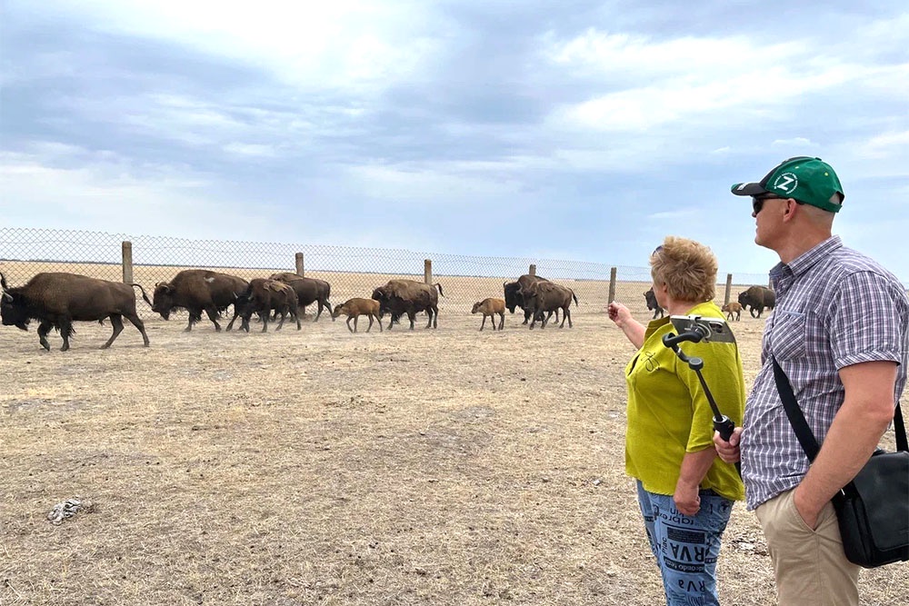 В "Аскании-Нова" обитает более 100 бизонов. При нас бизонье стадо пришло в движение и, как вихрь, понеслось по степи. За взрослыми едва поспевали рыжие детеныши. В этом году в заповеднике родилось почти 30 бизончиков, что считается большой удачей.