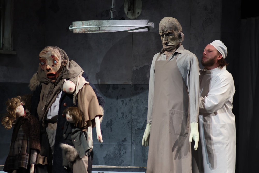 Создатели спектакля уверяют: главного героя в финале надо пожалеть, но… никакой жалостью в их постановке не пахнет, сплошной формалин - все происходит среди забальзамированных тел, иногда "играют" лишь человеческие ноги да руки… Никакого просвета.