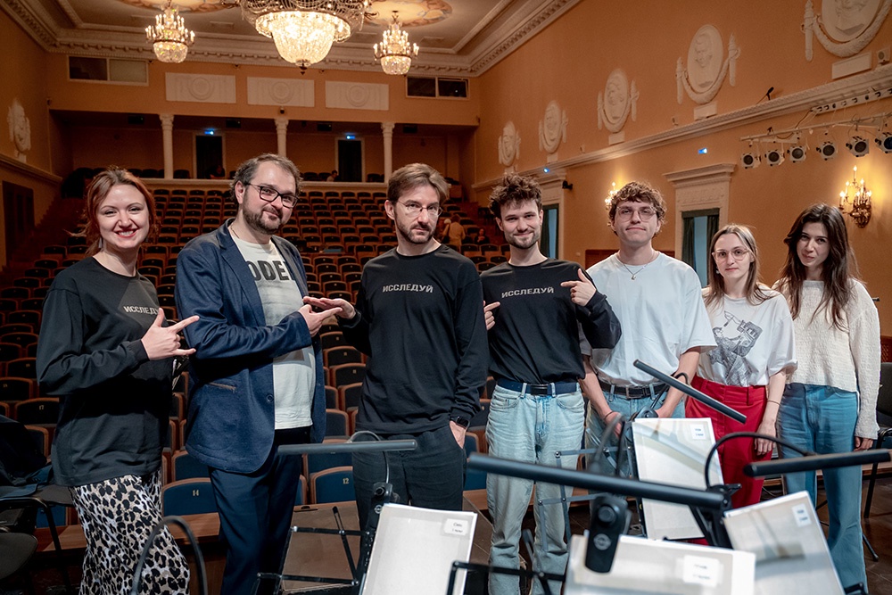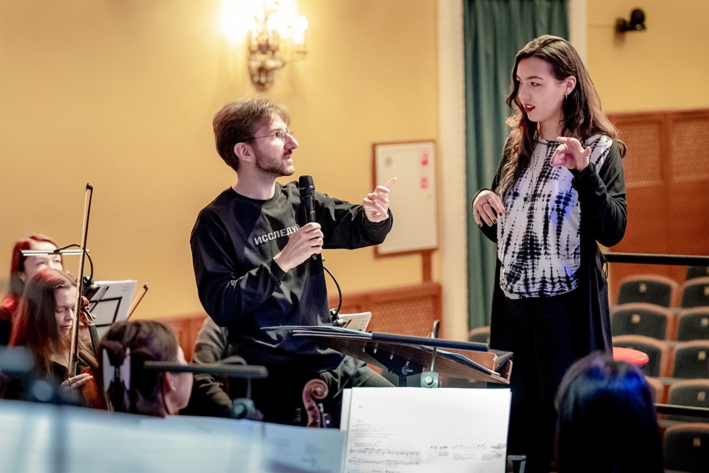 В зале сидели слушатели - студенты челябинских вузов, педагоги, меломаны разных возрастов. Им тоже давали микрофон, чтобы они рассказали авторам, какие ассоциации рождала их музыка. С третьей стороны свои предложения говорили со сцены артисты оркестра, дирижер Алексей Рубин - он в свою очередь объяснял, откуда возникают новые звуковые эффекты. Например, Станислав Фролов использовал шарик на спице, а еще заставил духовые инструменты издавать особые призвуки (сразу несколько звуков), которые называются "мультифоники".