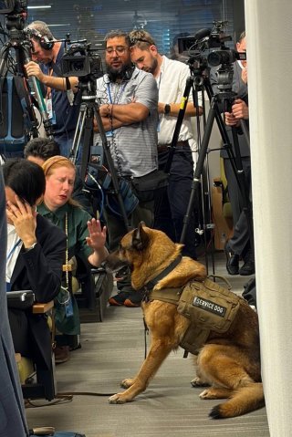 Но самым неожиданным стал момент, когда несколько раз после завершения эмоциональной фразы министра из зала слышалось робкое тявканье. Не громкое, оглушительное, сбивающее с ног "гав-гав", а интеллигентное, с легкой хрипотцой, приободряющее. Оказалось, что в одном из проходов сидит овчарка - специально приведенная сотрудником ООН для обеспечения безопасности. Видимо, в выступлении Лаврова собаке несколько раз что-то пришлось по душе - вот она и откликалась как могла на оценки мировых событий.