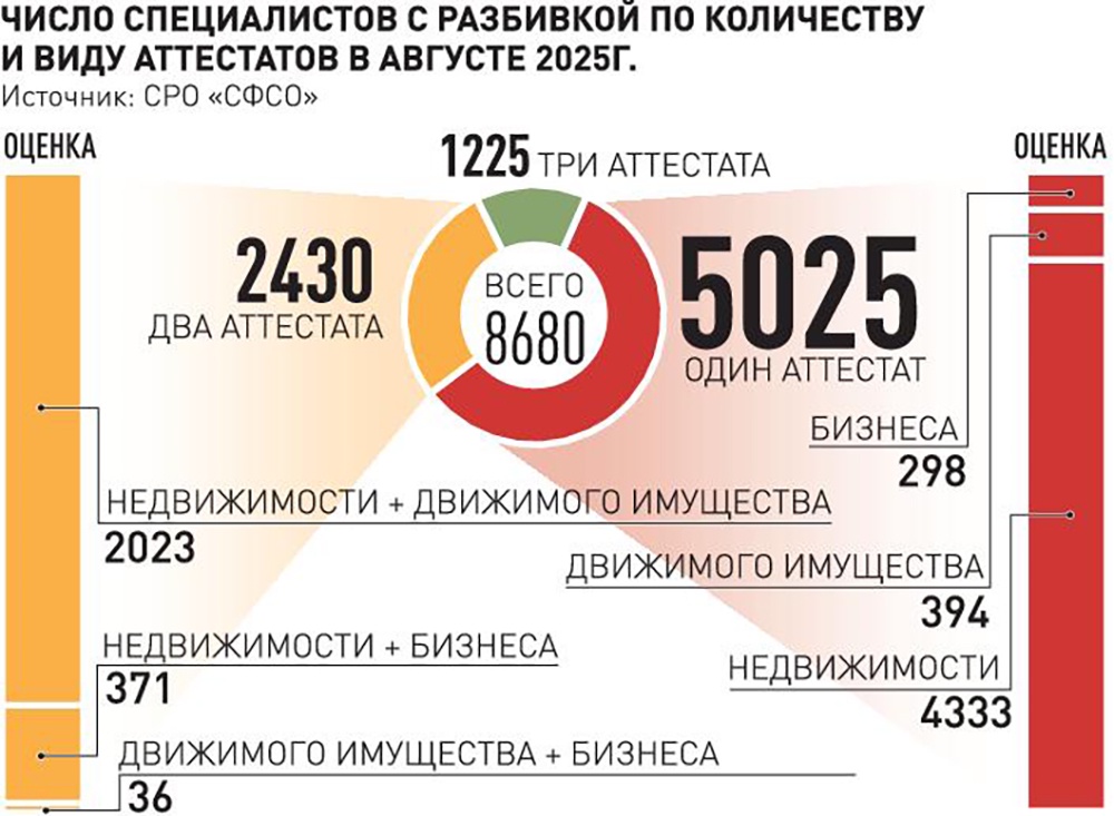 Так, по официальным публичным данным ФБУ "Федеральный ресурсный центр", который осуществляет экзаменацию оценщиков и выдачу квалаттестатов, по состоянию на середину августа 2025 года в России было всего 8680 оценщиков, имеющих не менее одного квалаттестата со сроком действия не менее трех месяцев, при этом универсальных оценщиков, имеющих все три квалаттестата по направлениям "Оценка недвижимости", "Оценка движимого имущества", "Оценка бизнеса", насчитывалось 1225 человек.
