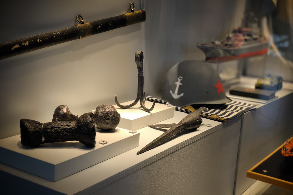Почетное место в выставочной экспозиции заняли модели десантной техники: торпедные катера, тральщики и даже автомобили-амфибии. Из своих фондов Музей Мирового океана представил вещи командующего Балтийским флотом в 1939-1947 годах адмирала Владимира Трибуца, а также награды, документы и элементы форменной одежды участников штурма косы Фрише-Нерунг. Значимое место в выставочном пространстве заняли работы советских фотокорреспондентов Леонида Коровина и Аркадия Шайхета, которые непосредственно участвовали в тех событиях.