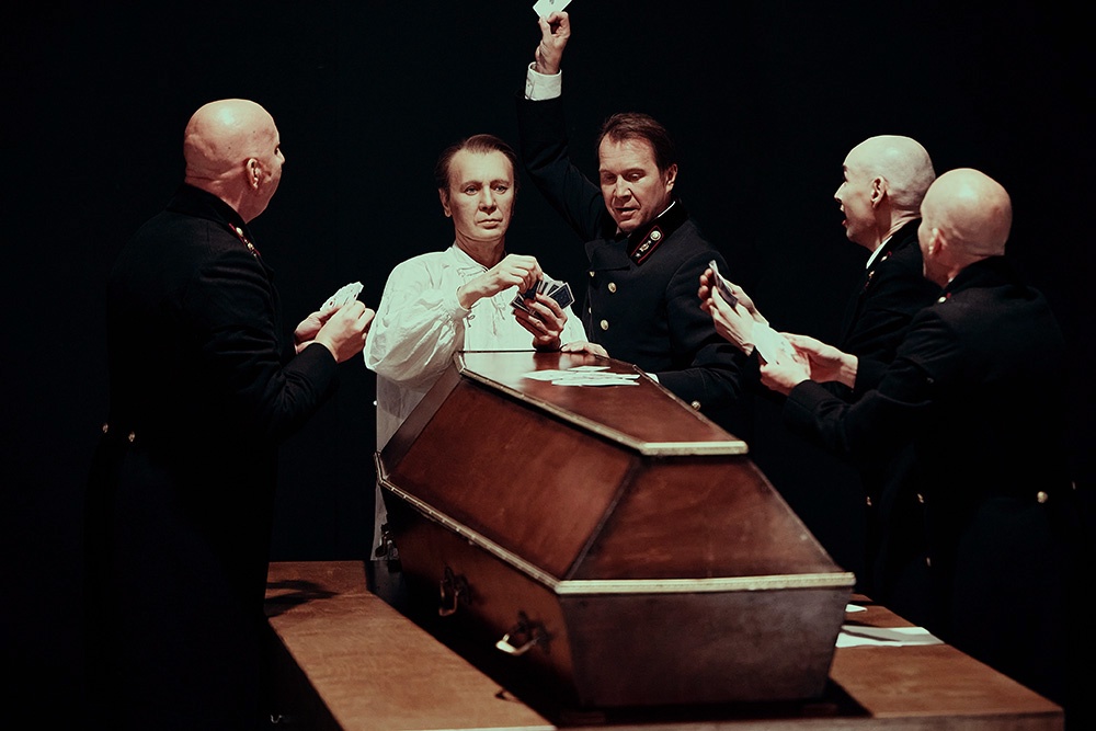 Кукольная, а также масочная тема ключевая в этом странном спектакле, который порой напоминает не постановку повести Толстого, а комедию "дель арте", но только в стиле "нуар". На восковую куклу похож лежащий в гробу Евгений Миронов, и когда он восстает (буквально) из гроба, это впечатляет, и мурашки по коже бегают. Но и восстав, став живым, он тут же обретает кукольного двойника в исполнении Леонида Тимцуника, на Миронова очень похожего, но еще более воскового и с кукольными движениями, которые заставляют отбросить мысль, что это метафорическая душа героя, отделившаяся от его мертвого тела. Нет, жив скорее мертвец, а это все же его кукла.