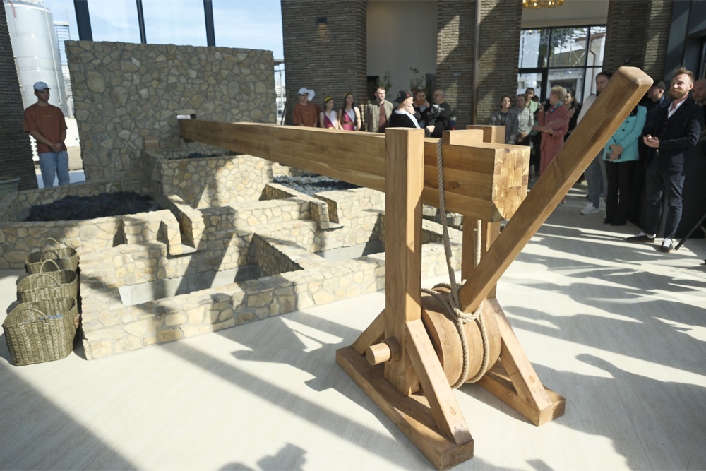 Помимо этого здесь воссоздан рычажный пресс, представляющий собой деревянную горизонтальную балку весом 600 килограммов, на другом конце - булыжник в качестве противовеса. По словам экспертов одного из винных заводов в Темрюкском районе, с помощью такой продуманной конструкции, запускаемой в действие без видимых усилий, можно переработать до 300 тонн урожая за сезон.