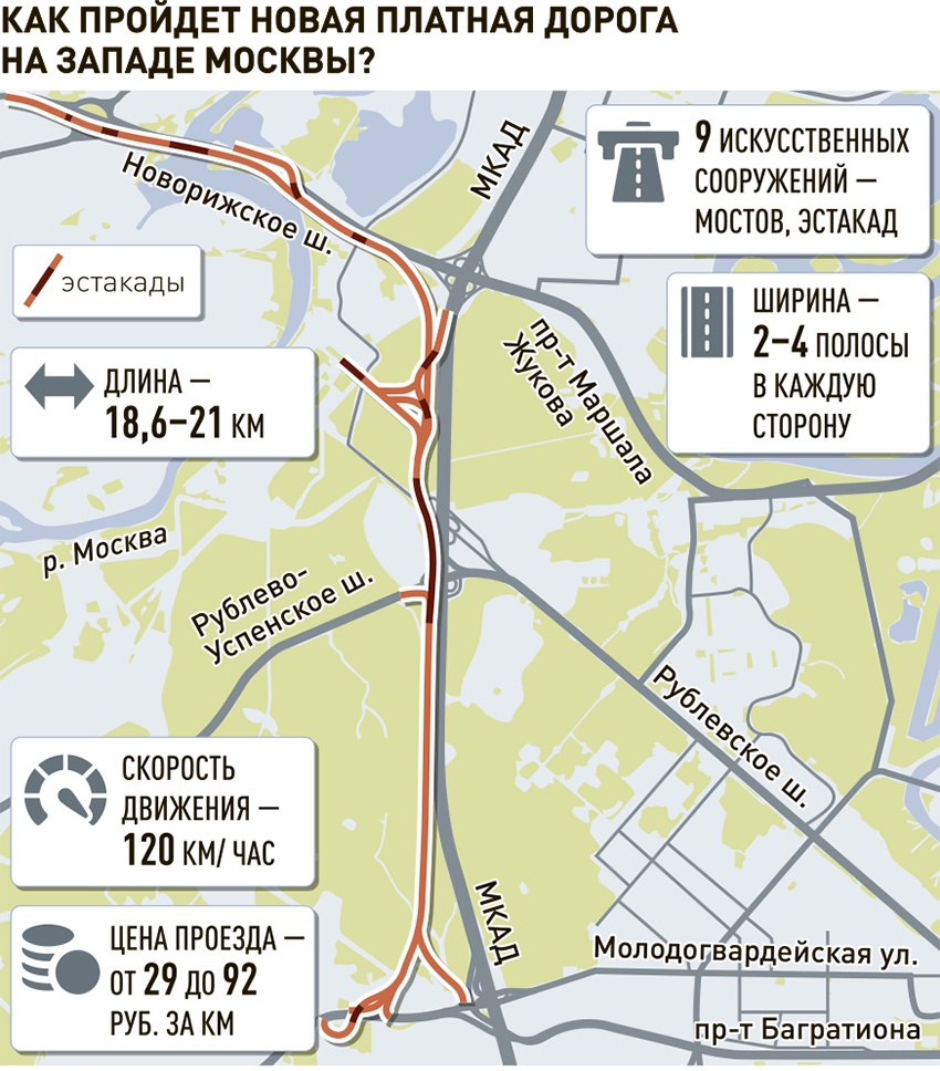 На сооружение магистрали отводится четыре года. Концессионер сможет пользоваться ею 45 лет, взимая плату за проезд от 29 до 92 рублей за километр. Расчетная стоимость строительства - 77,5 миллиарда рублей. Новая дорога может стать пятой платной дорогой в столичном регионе, в дополнение к уже действующим: федеральной трассе Северный обход Одинцово, М-11 "Нева", Московскому скоростному диаметру и проспекту Багратиона. Самая дешевая из них - МСД, цена участка на которой в пиковые часы с 13 октября подорожала с 7 до 10 рублей, и весь проезд по ней обходится для москвичей не более 100 рублей, а для транзитного транспорта - 950 руб. В тройку самых дорогих среди платных дорог входят проспект Багратиона и Северный обход Одинцово, где владельцы легковушек платят в среднем по 30 рублей за километр. Но и они не пустуют. Более того, по словам заммэра Москвы по вопросам транспорта и промышленности Максима Ликсутова, за два года работы проспект Багратиона стал еще одной визитной карточкой Москвы, так как дал москвичам возможность добираться от МКАД до делового центра "Москва-Сити" буквально за 10 минут.