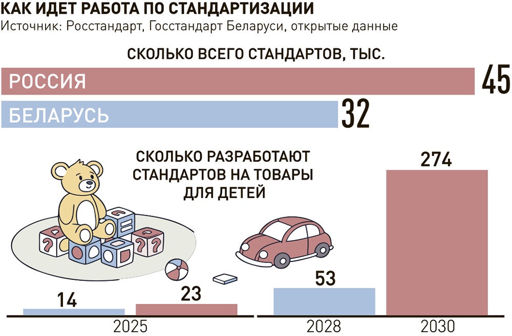 В Беларуси в настоящее время выполняется программа стандартизации в области товаров и услуг для детей на 2024-2028 годы. Уже разработано девять государственных стандартов, устанавливающих требования к средствам для обучения плаванию, конструкциям для скалолазания, скейтпаркам и веревочным дорожкам. Вполне логично масштабировать эту деятельность в рамках Союзного государства.