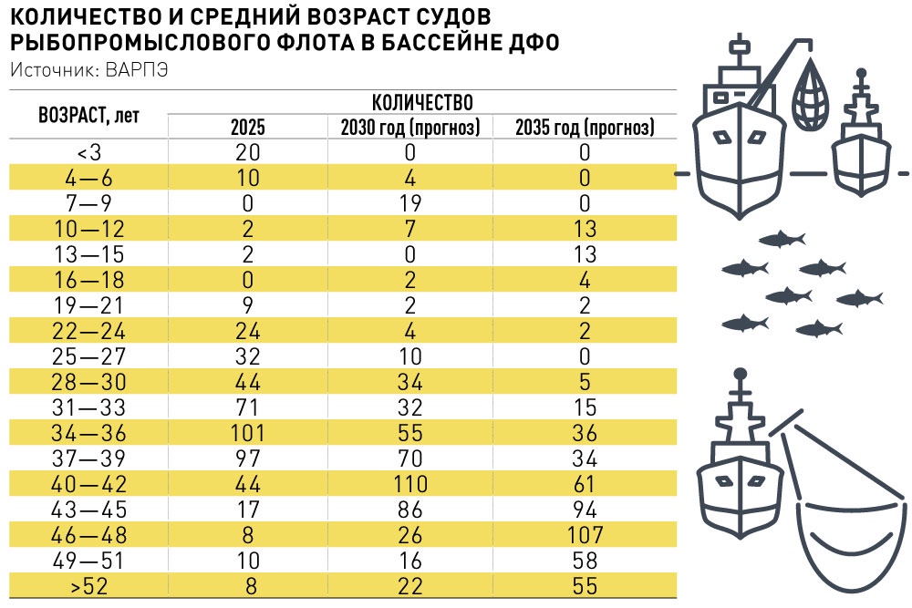 Первыми на выдвинутую инициативу отреагировали рыбаки. В частности, во Владивостоке состоялось заседание членов Ассоциации рыбохозяйственных предприятий Приморья (АРПП). В нее входят более 30 организаций края. Между тем у рыбаков Дальневосточного бассейна, мягко говоря, далеко не молодой флот. По данным исследования, которое провели "Опора России" и Всероссийская ассоциация рыбохозяйственных предприятий, предпринимателей и экспортеров (ВАРПЭ), предоставленного "РГ", в 2025 году дальневосточные моря бороздят 87 рыбацких судов возрастом старше 40 лет. Это 17 процентов всего промыслового флота в макрорегионе. Хуже того: по прогнозам к 2030 году таковых будет 260 (52 процента), а к 2035-му - 375 (75 процентов).