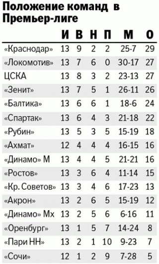 Результаты матчей 13-го тура: "Спартак" - "Оренбург" - 1:0, "Ростов" - "Динамо" (Махачкала) - 1:1, ЦСКА - "Крылья Советов" - 1:0, "Акрон" - "Локомотив" - 1:1, "Пари НН" - "Балтика" - 0:0, "Зенит" - "Динамо" (Москва) - 2:1, "Краснодар" - "Рубин" - 1:0, "Ахмат" - "Сочи" - 2:4.