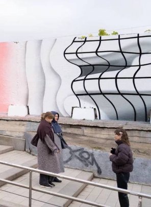На этот раз на серых стенах, например, очень реалистично изобразили фасад панельной многоэтажки.