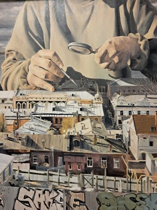 Нижегородский стрит-арт, который отличают любовь к истории города и эстетизация, здесь представлен не росписью стен, а живописью Андрея Оленева графикой Артема Филатова, инсталляцией и "театром теней" Никиты NOMERZ. Город у этих художников предстает живым существом, то ли великаном, как на полотне Оленева, то ли невидимым хранителем, чей жест руки высвечен на куске старой доски, как у Никиты NOMERZ. Он связан с природой, самыми обычными растениями, будь то подорожник или чертополох, как у Артема Филатова. Он живет в каком-то своем ритме, как таинственные "матры" Евгении Гольцевой, у которой похожие на деревянные детские пирамидки или матрешки объекты становятся персонажами - Волгой и Окой.