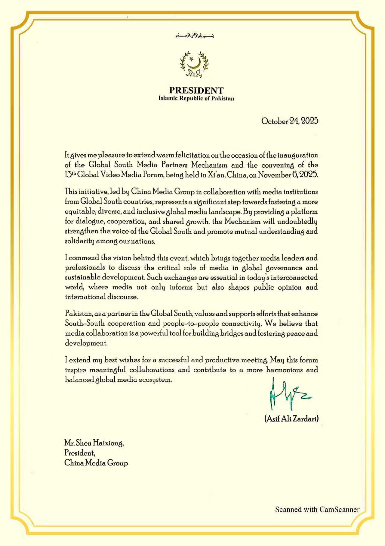 В своем поздравительном письме Асиф Али Зардари отметил, что инициатива Медиакорпорации Китая по созданию механизма "Партнеры медиа Глобального Юга" представляет собой важный шаг на пути к формированию новой, еще более справедливой, равноправной, многополярной и инклюзивной архитектуры глобальных коммуникаций.