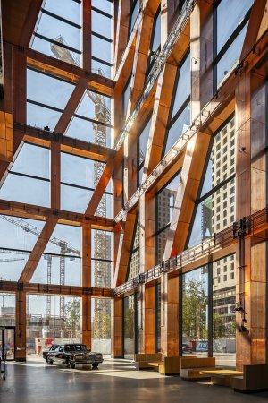 Сергей Чобан: На мой взгляд, вся архитектура сегодня является наследницей именно конструктивизма. И конструкцию фасада музея "Коллекция" держат огромные "фермы" - с косыми и прямыми стойками. Они создают образ портала и одновременно отсылают к производственной теме, к мотивам конструктивизма конца 1920-х - начала 1930-х. Конечно, наш проект укоренен в этой истории. Но в первую очередь мы идем от колоссального общественного пространства бульвара, на который выходит этот портал, эта лоджия. Самым важным было не только выдержать чистоту стиля, индустриального или постиндустриального, а спроектировать общественное пространство музея, которое было бы непосредственным продолжением общественного пространства главного бульвара ЗИЛАРТа. Отсюда - приглашение известных художников, работающих в жанре уличного искусства, для росписи эскалаторов внутри музейного атриума. Тут работали настоящие мастера - Дмитрий Аске, Андрей Бергер, Алексей Лука и Максим Има. Из той же идеи соединения внешнего и внутреннего пространства происходит и один и тот же материал фасада и интерьеров общественных зон внутри музея. И да, этот материал - медь. Таким образом и материал, и граффити говорят: мы еще не в музейном пространстве. Мы в той "переходной зоне", лоджии, которая и вне здания, и внутри него.