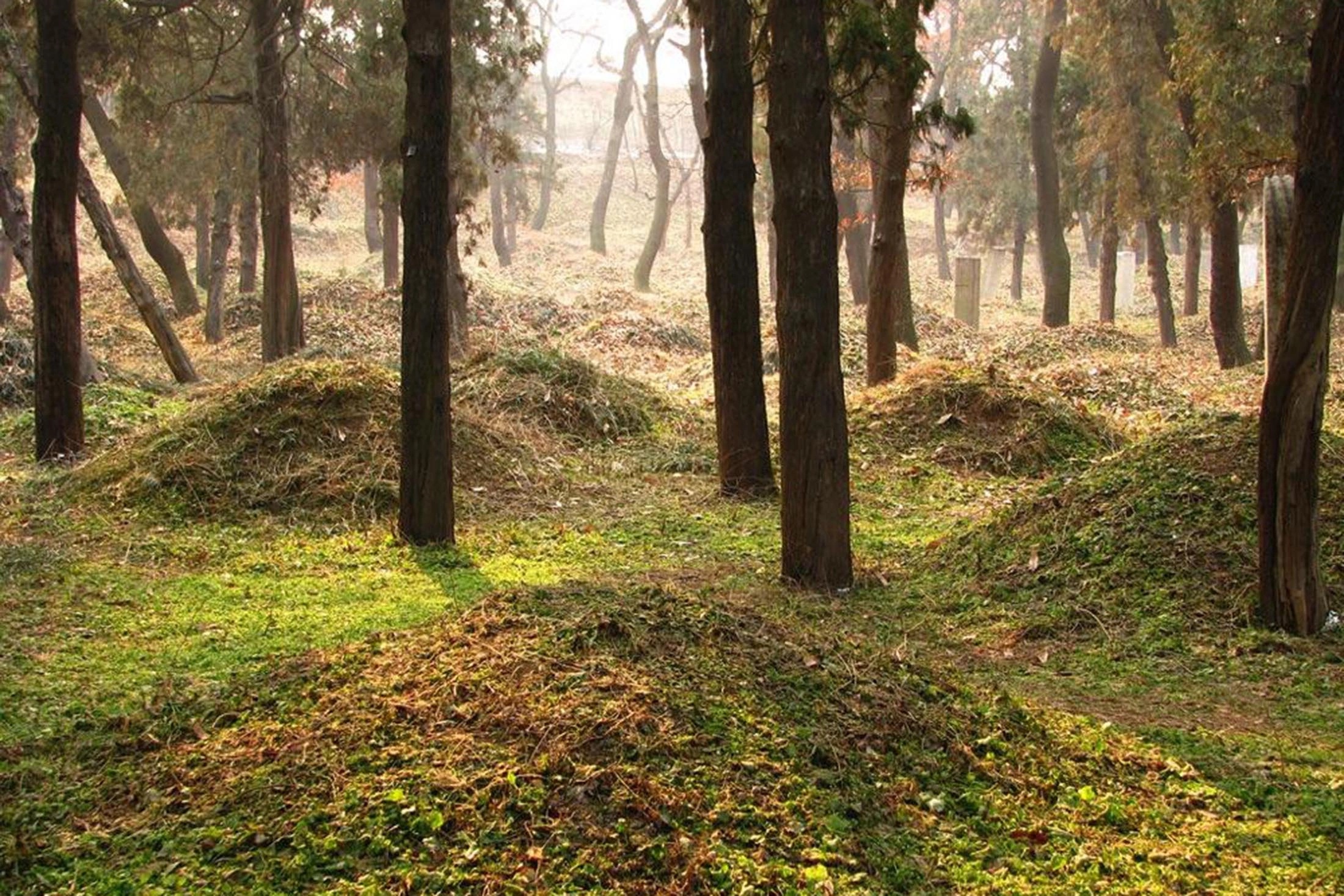 По всему кладбищу разбросаны холмики: чем более уважаем покойник, тем больше холм. У Конфуция - целый курган. Большинство холмиков безымянные, но на четырех тысячах сохранились каменные таблички и надгробия. Встречаются и хаотично разбросанные по огромной территории скульптуры в форме традиционных драконов, а также черепах и почему-то лягушек.