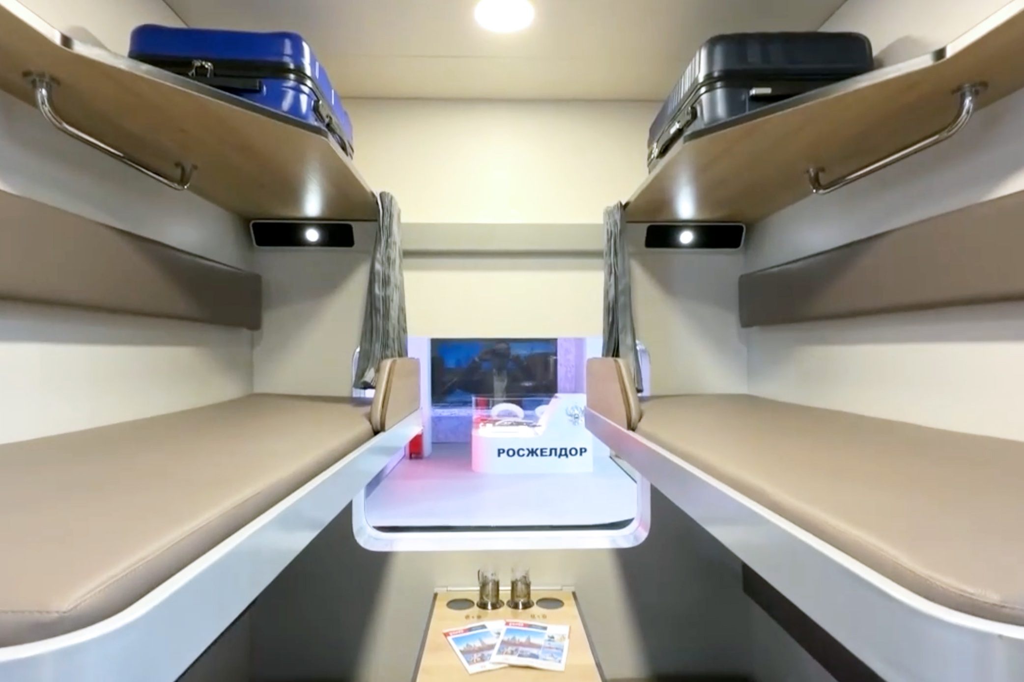 Новый вагон, соответствующий так называемому габариту Т, будет вмещать больше пассажиров: 58 мест против стандартных 54. Все спальные места оснащены индивидуальными шторками, розетками 220 В и USB, персональными светильниками и воздуховодами. Для пассажиров верхних и нижних полок предусмотрены отдельные столики.