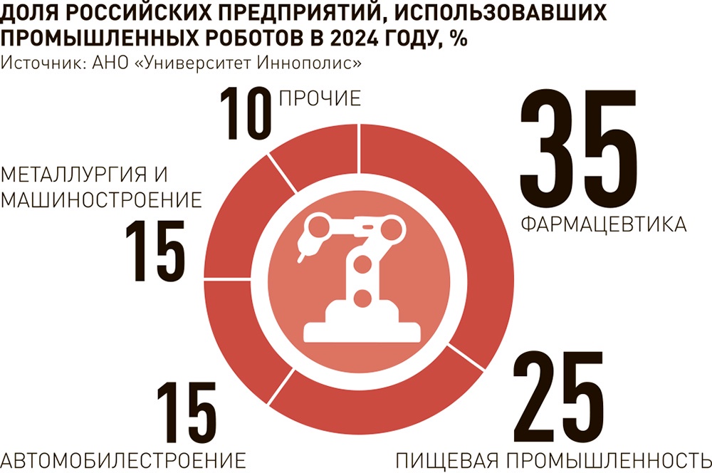 Больше всего роботов в России используется в фармацевтике, их применяет около 35 процентов всех производств, в пищевой промышленности - 25 процентов компаний, в автомобилестроении и машиностроении - 15 процентов предприятий.