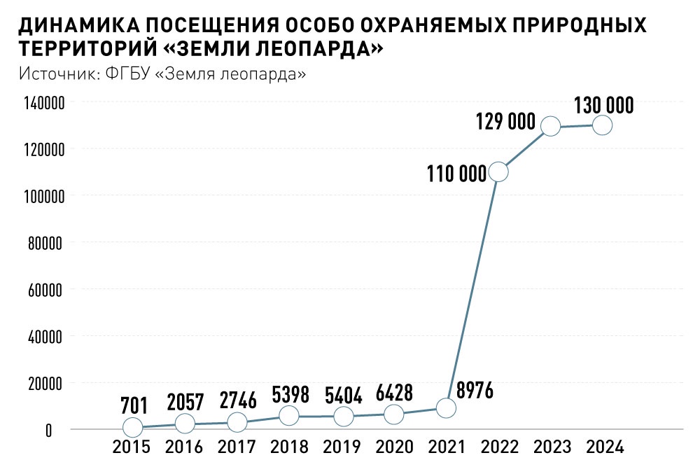 - Начинали мы подсчет с 2015-го, тогда нацпарк посетил всего 701 турист, - сообщила заместитель директора ФГБУ "Земля леопарда" по экопросвещению и международному сотрудничеству Мария Окулова. - И если в 2019 году гостей было около десяти тысяч, то сейчас эта цифра достигла 130 тысяч. И, соответственно, доход от экотуризма растет с такой же динамикой экспоненты. Этот внебюджетный актив инвестируют в развитие - как в охранные мероприятия, так и, собственно, в экотуризм.