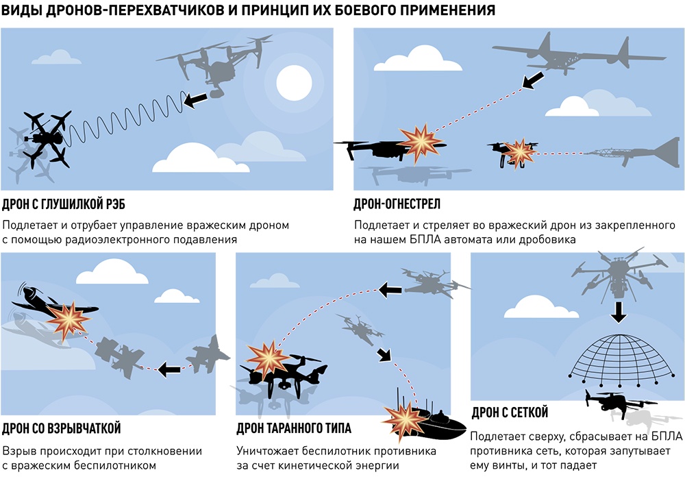 Такие дроны делятся на пять видов в зависимости от того, как именно они уничтожают БПЛА врага. Первые оснащены глушилками. При подлете к другому дрону на них включается радиоэлектронное подавление, оно глушит врагу канал управления. И дрон противника либо падает, либо на нем включается режим возврата на базу.