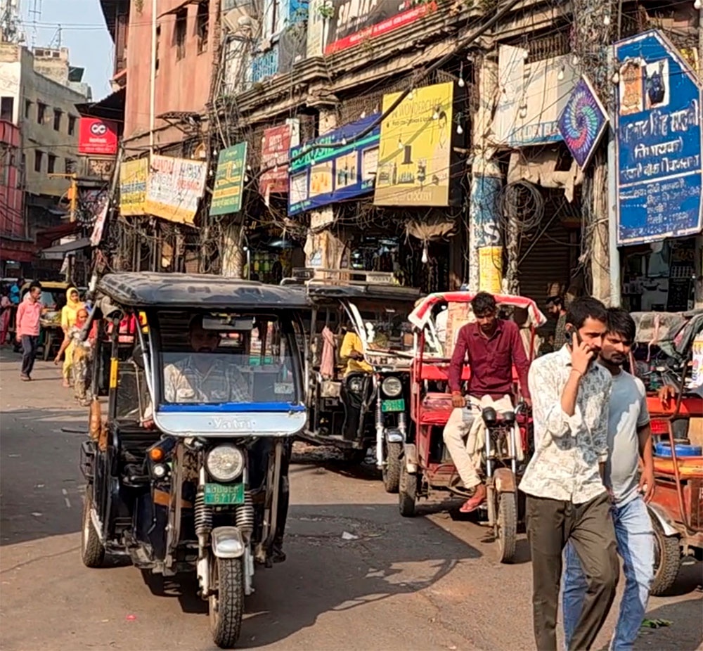 Поскольку проезд на машинах по узким улочкам запрещен, то лучше воспользоваться услугой велорикши. Сторговавшись за двести рупий, мы уселись вдвоем, поехали. Худющий, весом не более 45 кг, рикша не без труда вез нас, двух упитанных белых, - впрочем, на сиденьях некоторых других таких же повозок ехали трое и даже четверо пассажиров. Мы продирались сквозь массу тук-туков и велорикш - непрерывное гудение множества клаксонов, крики, брань, смех, - это было неповторимо. Причем удивительно, что в том жутком, почти броуновском беспорядке никто никого не задевал, все как-то умудрялись оставаться целыми.