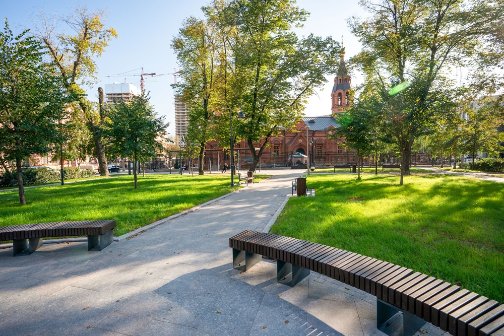 "Теперь там создано комфортное пространство для тихого отдыха с современным освещением, удобными скамейками и зелеными насаждениями", - сказал он. Планировка сквера осталась прежней - центральная аллея с круглой площадкой посередине и две боковые, соединенные с ней. На прогулочных дорожках заменили покрытие общей площадью почти 925 квадратных метров.