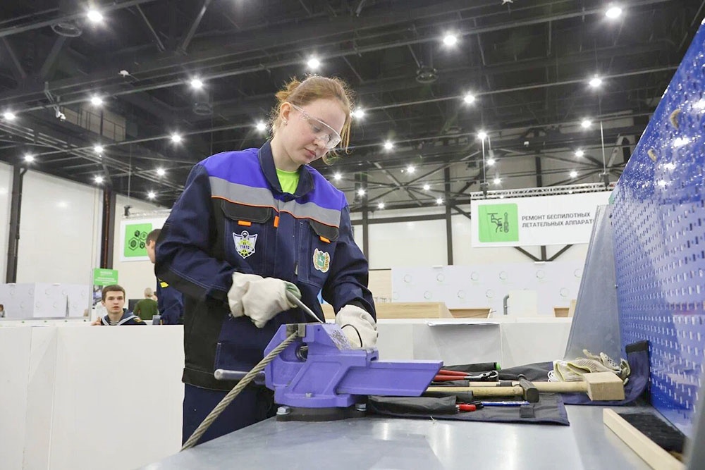С одной стороны жужжат мини-коптеры - это соревновательная площадка по компетенции "Летающая роботехника", с другой - жужжат фены - это в мастерстве укладки состязаются девчонки - будущие парикмахеры. На весь павильон раздается стук молотка по металлу - хрупкая девушка в спецовке кует какое-то хитрое корабельное крепление. Это компетенция "Эксплуатация судов водного транспорта". У вожатых, есть на чемпионате и направление "Вожатское дело", веселье: концерт, имитирующий вечернюю "свечку" в летнем лагере.