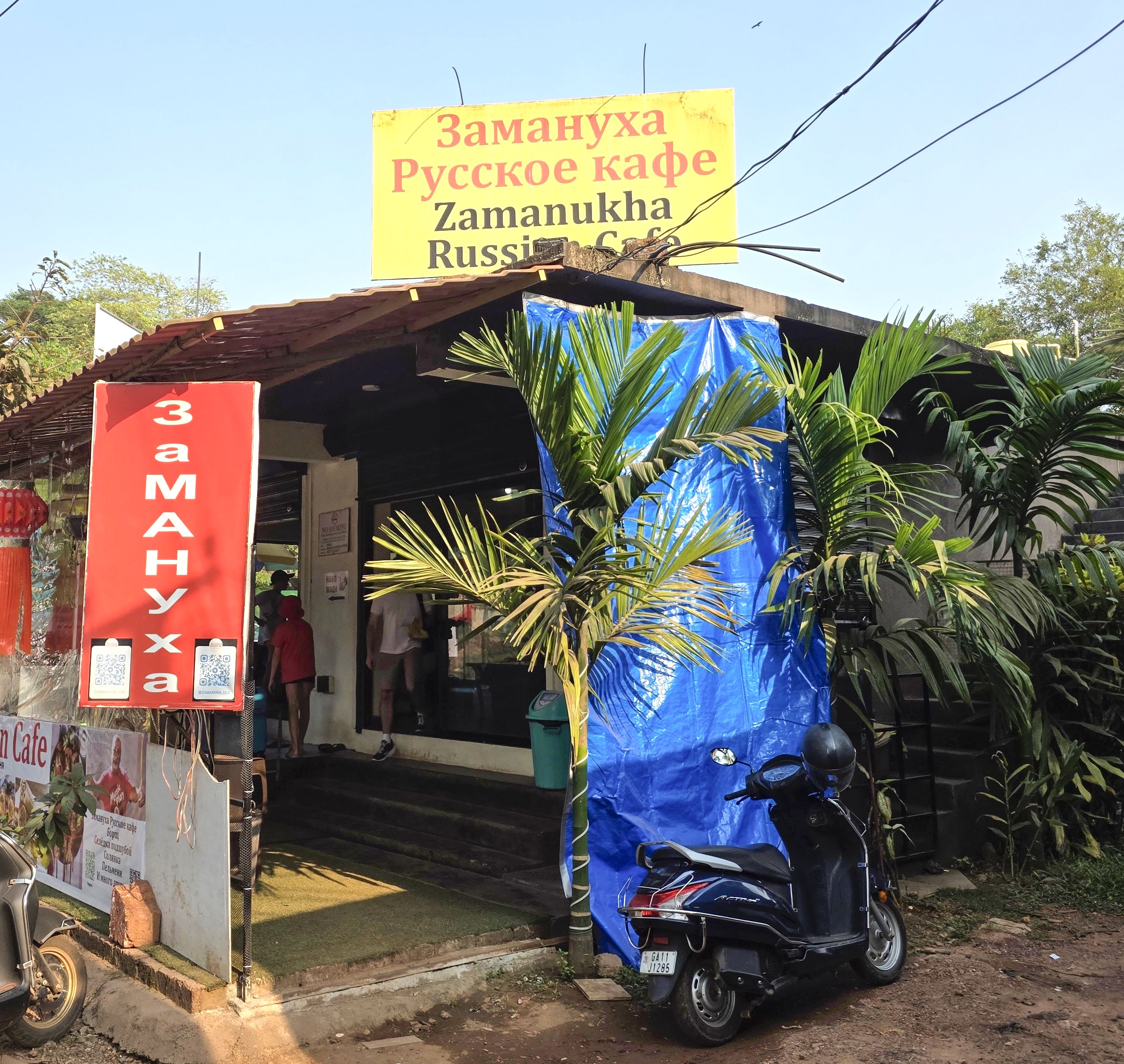 Но вот едем мы на машине через джунгли северной части штата Гоа, пересекаем мост через реку Чапоры, сразу за рекой начинается деревня Морджим. А на околице этого типичного индийского поселения скромная постройка с большой надписью на родном языке - "Замануха. Русское кафе". А чтобы ни у кого не возникало сомнений, насколько это заведение русское, на другом объявлении, у входа, перечислены блюда из предлагаемого ассортимента: борщ, солянка, шашлык, пельмени, винегрет, котлеты, сельдь под шубой, пирожки с картошкой.