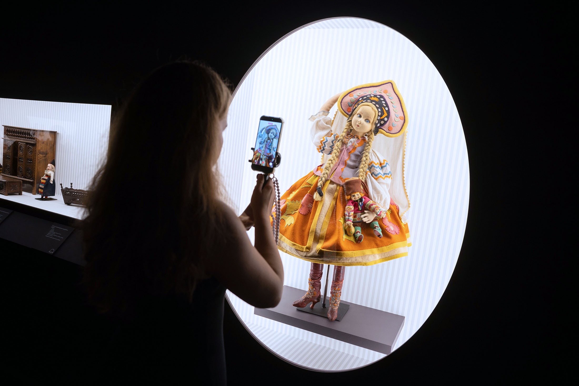 Трудно сказать, когда именно куклы вышли из детской и двинулись в дипломатию, но на выставке есть чудесный пример их участия в большой политике. Восемь кукол в костюмах народов Российской империи были созданы в связи визитом во Францию в 1896 году императора Николая II и подарены его семейству. Нельзя не заметить, что на материал к народным костюмам мастера не поскупились: золотная нить и атласные ленты, бисер и искусственный жемчуг, вышивки и роспись акварелью - "простонародные" куклы в таком исполнении были поистине царским сокровищем.