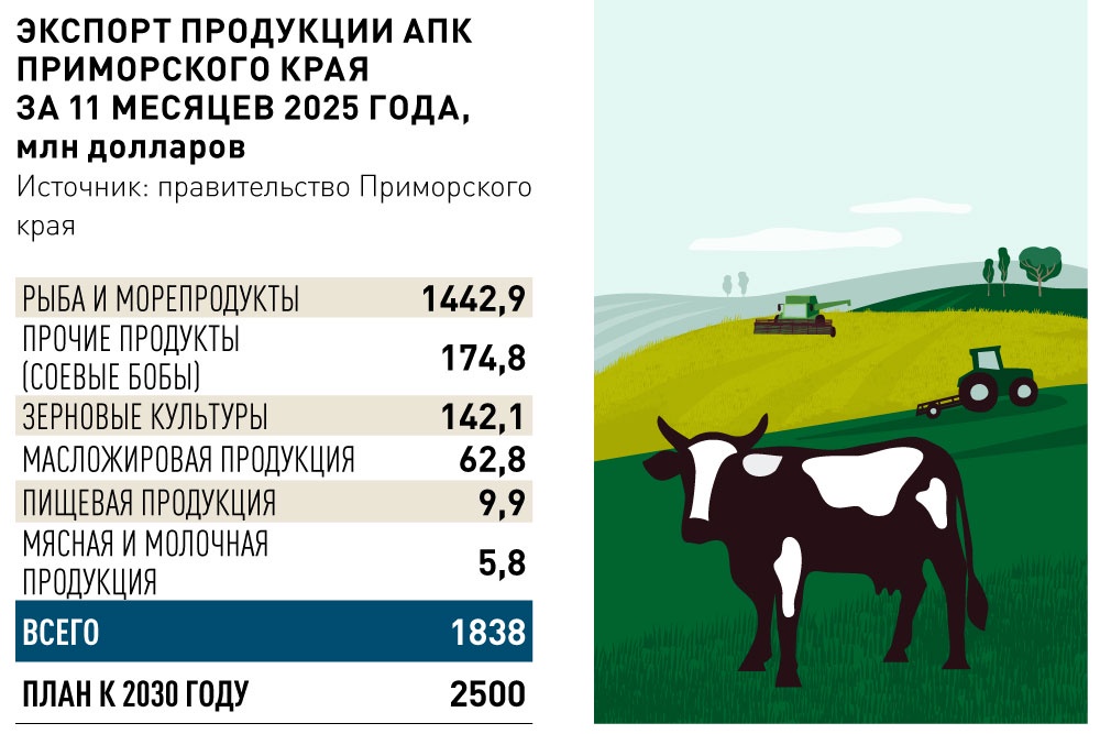 - Пока основа экспорта Приморья - рыба и морепродукты, на них приходится более 90 процентов его стоимости. Мы с 2022 года сильно просели по этому направлению за счет потери европейского и американского рынков белой рыбы - минтая и трески. Но постепенно идет замещение, появляются новые страны-импортеры. С 2019 года увеличиваем объемы производства зерновых. В структуре экспорта заметно выросла доля зерна, пищевой продукции и технических культур. Это перспективный растущий рынок, - сообщил министр сельского хозяйства Приморского края Андрей Бронц.