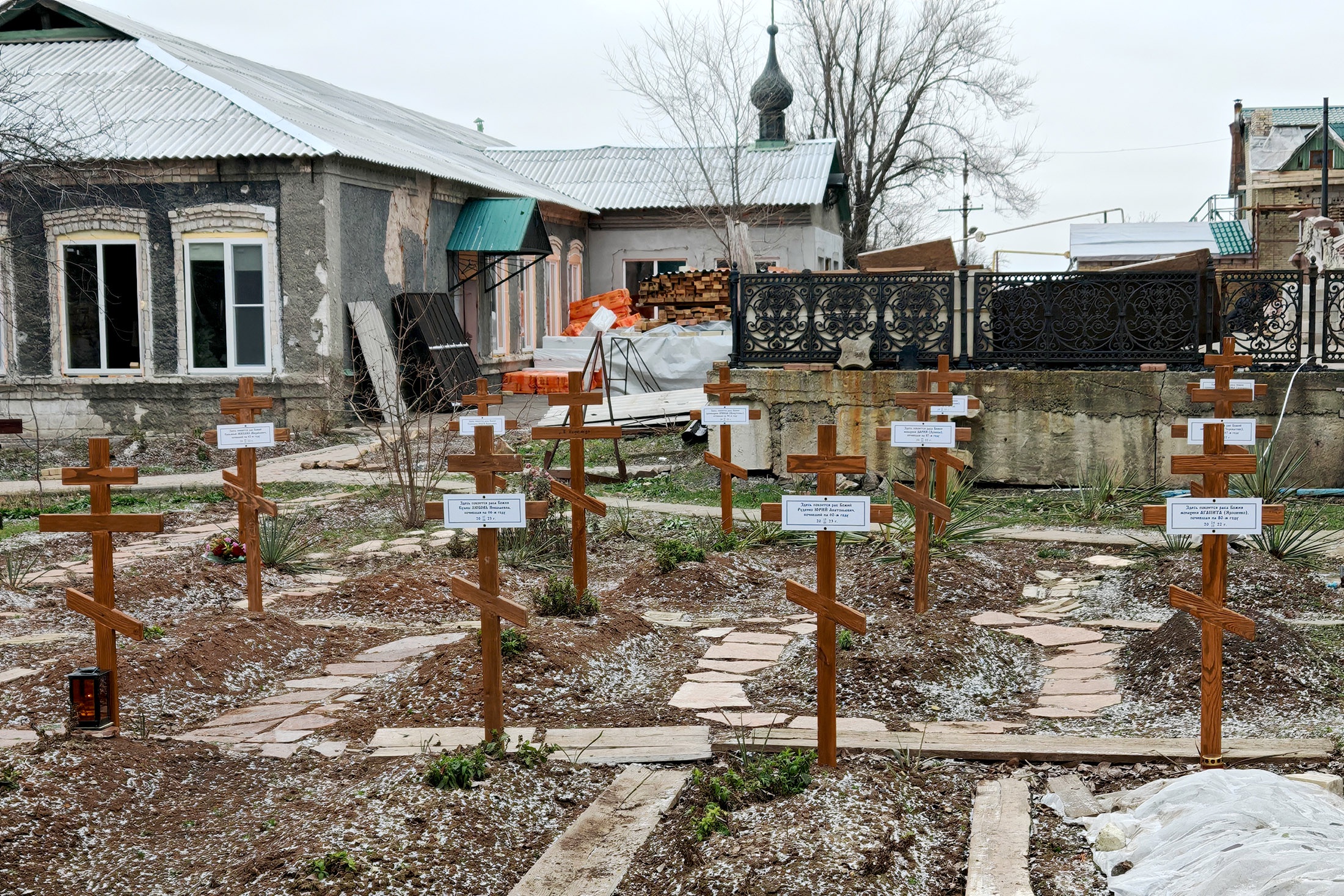 - За 2,5 года обстрелов все корпуса практически разрушены. Только в храм было 25 прямых попаданий. Линия фронта проходила в километре от нас. Вон там на шахте украинские наблюдатели следили за нами в мощную оптику. А из той посадки в серой зоне выезжал танк и работал по нам. Все горело, упал купол, прилетали "Хаймарсы", однажды штук шесть сразу ударили. Страшно было. Мы молились, слушали небо, быстро бегали, но все равно были раненые и убитые. Хоронили погибших по ночам возле храма, могилы копали при луне: днем по нам стреляли. Но службу в нижнем храме не прекращали даже под обстрелами, - говорит отец Иннокентий.