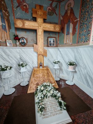 На фоне общей разрухи выделяется практически неповрежденная часовня, внутри которой царит умиротворение. Именно здесь захоронен старец Зосима. Когда-то к месту его погребения выстраивались длинные очереди. Теперь сюда можно пройти без длительного ожидания. Поставить свечку, помолиться. "Батюшка принимает", - говорят здесь. Попадая внутрь, словно отстраняешься и от былых обстрелов, и от шума стройки. Резной деревянный крест с лампадкой, цветы, иконы, росписи и фотография старца с понимающими добрыми глазами.
