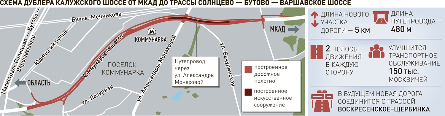 Помимо этого новое шоссе примерно на пять процентов снизило нагрузку на улицу Александры Монаховой и проектируемый проезд № 812 на участке от Бачуринской улицы до Коммунарского шоссе. Время в пути для автомобилистов на участке от МКАД до трассы Солнцево - Бутово - Варшавское шоссе сократилось втрое - с 30 до 10 минут. Кроме того, новая дорога позволяет улучшить работу востребованного автобусного маршрута с999, на котором местные жители добираются к станциям метро, социальным и другим важным городским объектам. До 2028 года дублер Калужского шоссе будет продлен до трассы Воскресенское - Каракашево - Щербинка, в результате чего его длина вырастет почти вдвое и составит порядка 10 километров.