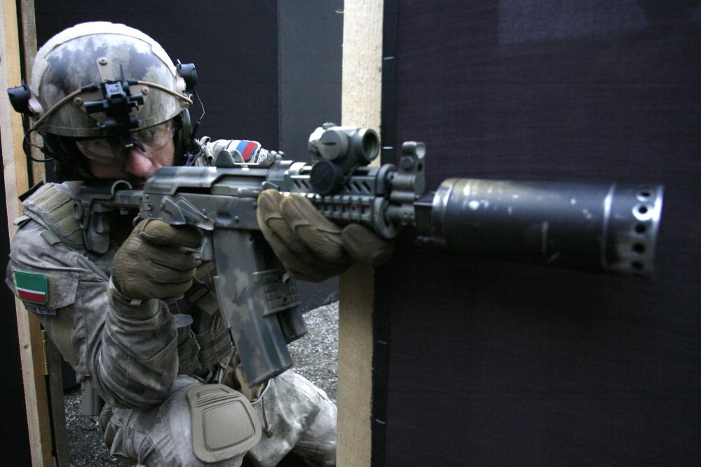 Следующая сцена разворачивается на перекрестке, где идет стрелковый бой. Солдат высовывается из-за круглой бетонной тумбы, чтобы дать очередь, когда рядом прилетает и хлопает FPV-дрон.