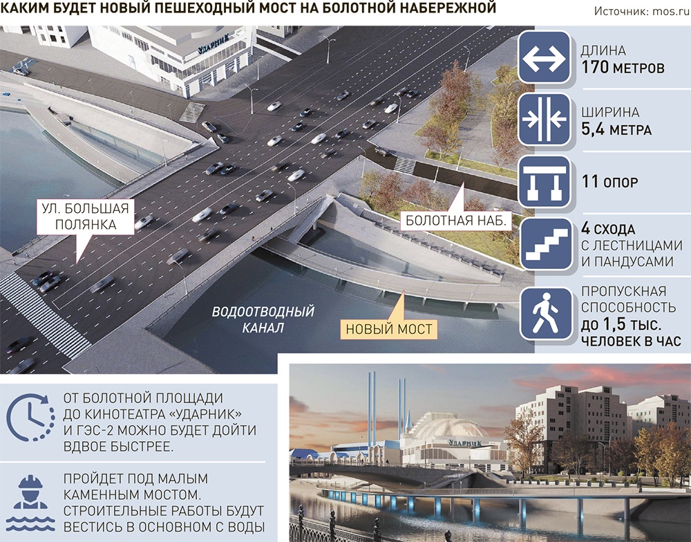 Еще один пешеходный мост уже начали строить, причем в самом центре Москвы - на Болотной набережной, возле кинотеатра "Ударник" и культурного центра "ГЭС-2". Сооружение необычное: мост соединит не разные, а один и тот же берег реки, к тому же пройдет под другим мостом - автомобильным. "Мост протяженностью порядка 170 метров будет располагаться в русле Водоотводного канала и соединит участки Болотной набережной, разделенные улицей Серафимовича. По ходу движения обустроим четыре схода на набережную. В результате завершим создание единого пешеходного маршрута, связывающего Воробьевы горы, парк Горького, Крымскую набережную и остров Балчуг", - рассказал заммэра Москвы по вопросам ЖКХ и благоустройства Петр Бирюков.