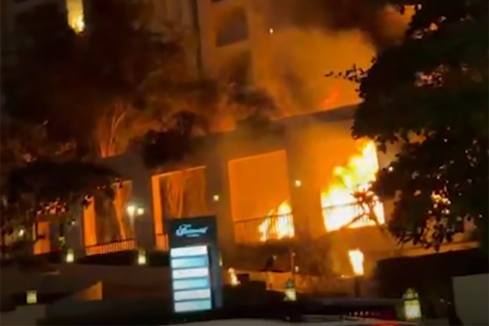 Очевидцы сообщают о возгорании в отеле Fairmont The Palm в Дубае. По неподтвержденным данным, пожар начался после того, как рядом с гостиницей упала часть от ракеты.