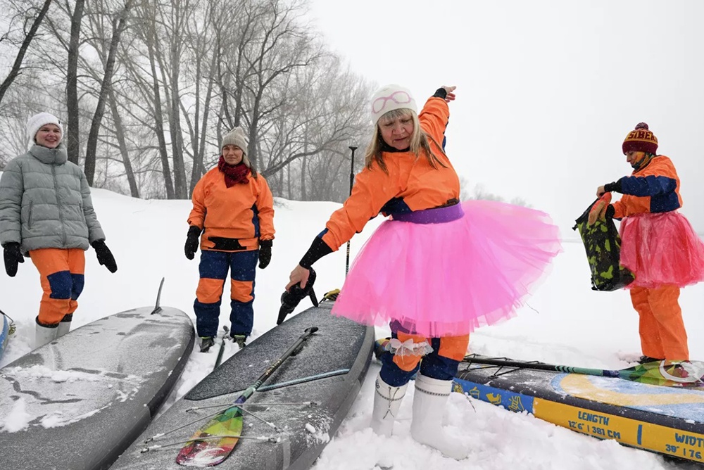 В Новосибирске также решили спортивно отметить праздник - участники клуба сапсерфинга провели заплыв по реке Оби, посвященный Международному женскому дню.